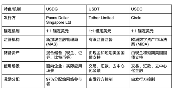 USDG 与两大主流稳定币 USDT 和 USDC 的对比。