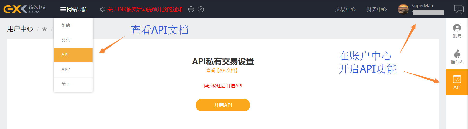 鉴于EXX目前交易量已经逐步稳定且不断攀升,以及用户的强烈建议,EXX于2017年11月18日正式开放API,有需求的用户可在账户中心的API页面(点我进入)进行开通,可以在网站导航下查看API文档(点我进入)。