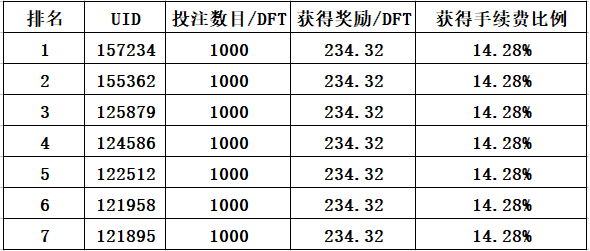 此次投注共7名投注1000DFT,故并列7位分享投注手续费。