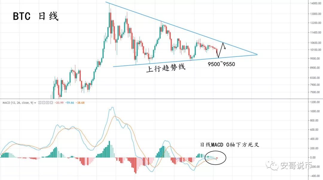 严格上讲,今年BTC这一波牛市行情是从二月份开始启动的,涨至年内最高近14000美金表现相当不错,牛市疯狂的过后必然是大脑对理性的回归。而近期的日线,MACD0轴下方附近的死叉,杀伤力不容小觑。考虑到下方支撑位在上行趋势线一带,这个位置重要之处在于一直没有跌破过,那么后期交易思路之一便是回撤这个支撑阻力(位置大概在9500~9550区域)去开仓多单,止损位置要往趋势线下设置100~200个点,防止假突破。