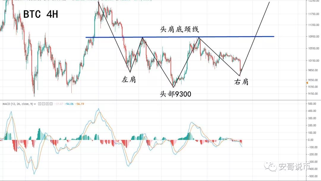 四小时还是我们上次提到的头肩底形态,这里不过多介绍,只强调一点,只要右肩没有低于头部9300之前,这个看涨形态就没有被破坏。
