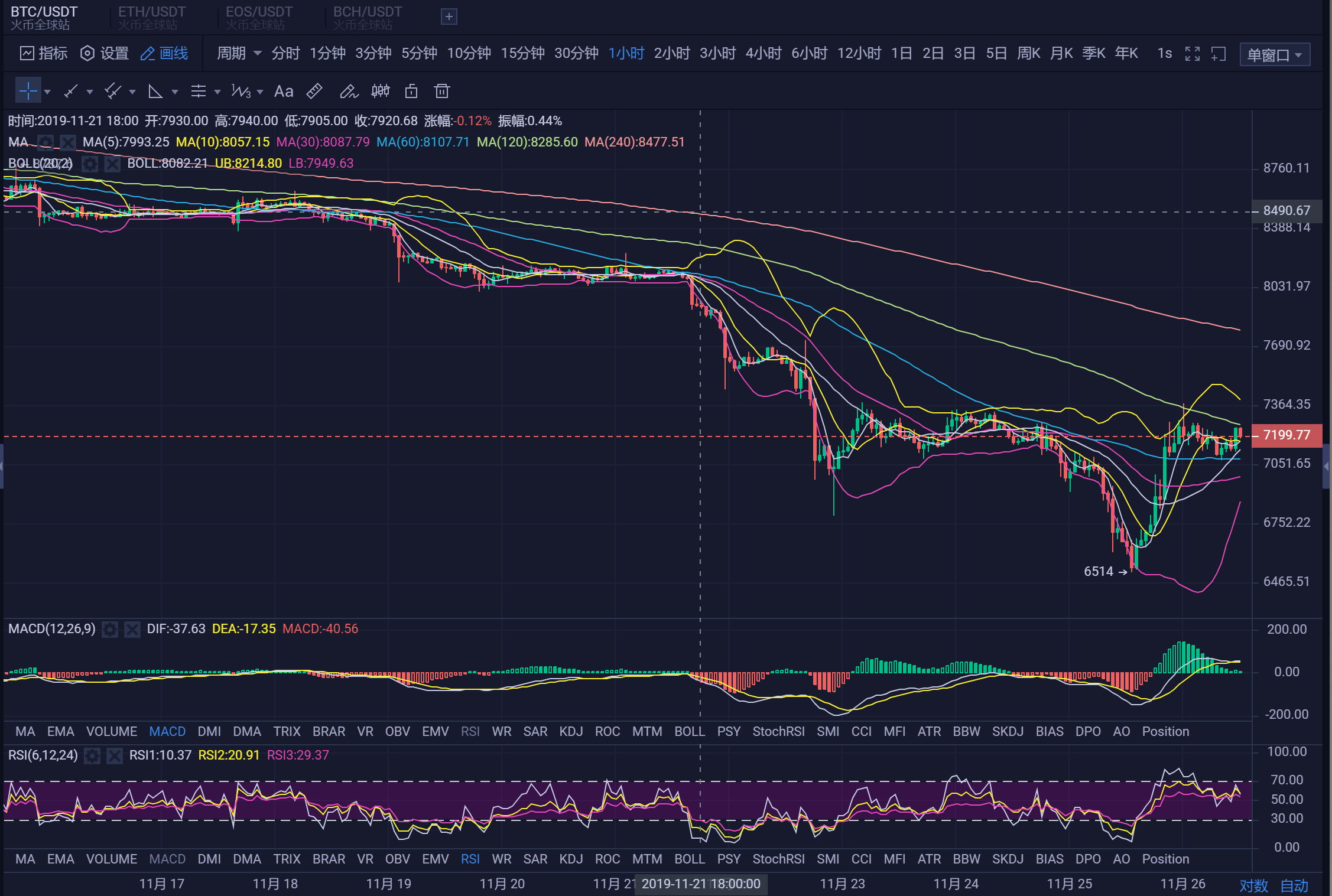 小结:昨天主流币市场迎来报复性反弹,在BTC触及6500后。几乎在去年同一时间,BTC的也是这个价格,当时是也是一轮牛市结束,从高点摔落到6500。不同的是当时是经过横盘2个月后,BCH硬分叉引发算力下降,重新开启了一轮下跌,而昨天是最近第一次接近6500这个价格,大跌之后遇到支撑展开反弹。历史总是有惊人的相似而又不是简单的重复。