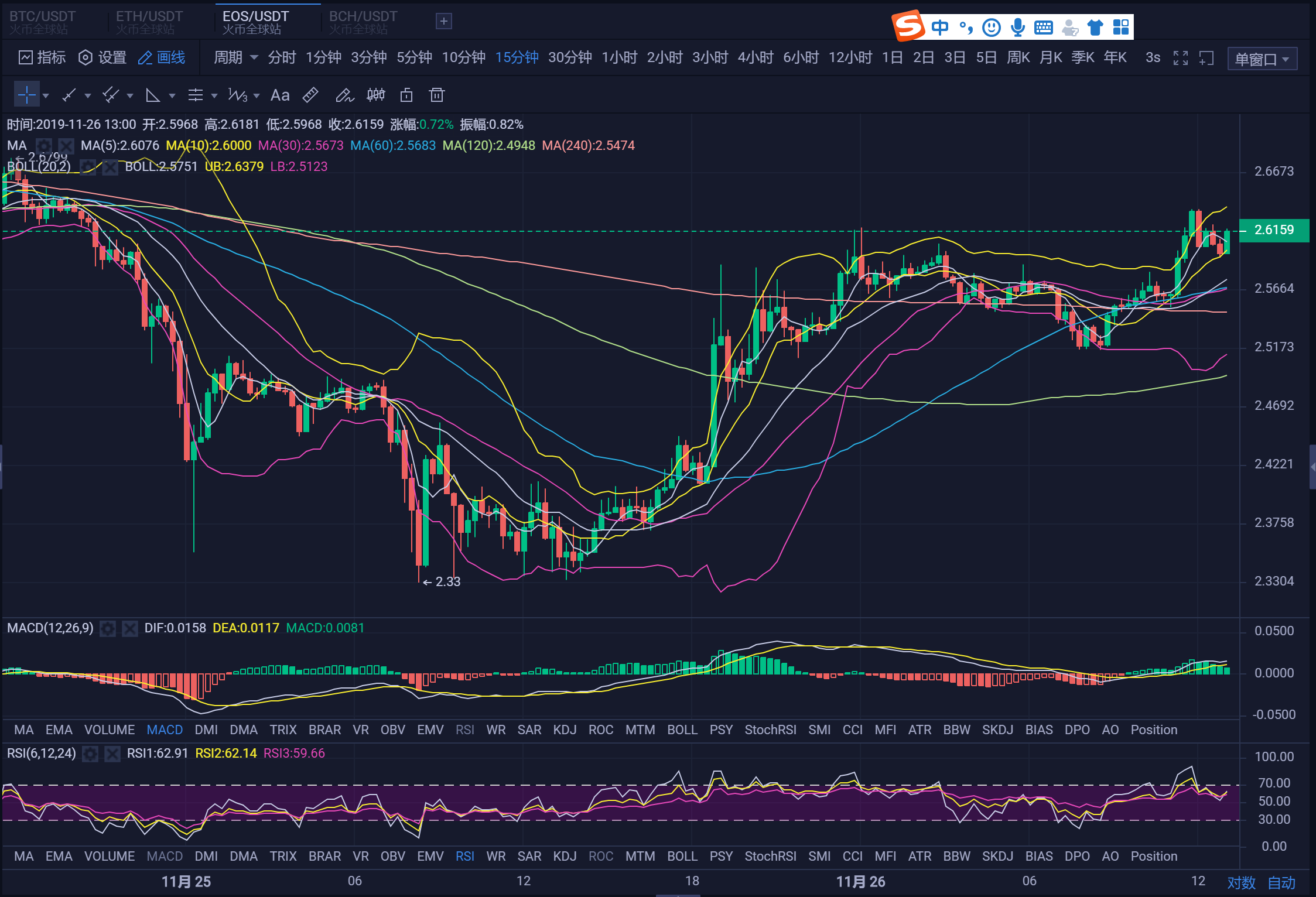 EOS:短线阻力2.63,2.68做空。但是柚子反弹是比较强的主流,所以空单进去之后价格可能有反复,所以有盈利并不是就能中线持有,所以建议有低点出来后继续空。做多的话柚子还是谨慎,2.53可以多,但严格止损。