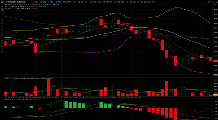 LTC:辣条日线图上行情下穿MA 5,10均线,MA CD图上两线相接近运行。4小时图上行情下穿多根均线,MA CD图上两线交叉有向下开口形态。操作思路上可以关注上方47.5附近空,看下方支撑位45.5破位持有,不破可以反手短多。