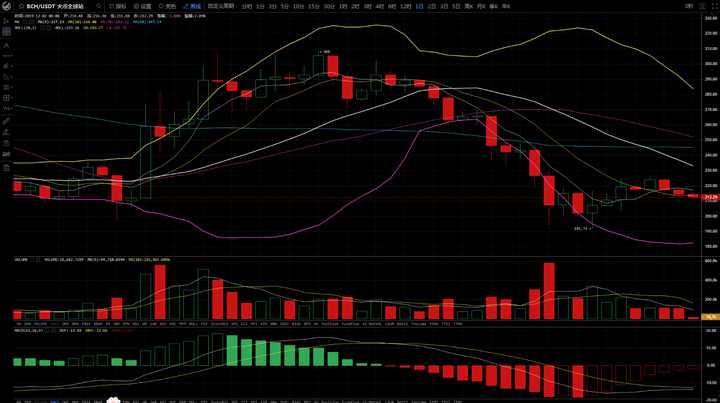 BCH:太子昨收阴柱,日线布林带有缩口姿态,MA CD图快速线向上接近慢线运行。4小时行情在布林带中下轨区间运行,下穿多根均线,MA CD两线相接近平行运行。操作思路上区间短线214.5附近可空,看下方210支撑位破位持有,不破可以反手短多。