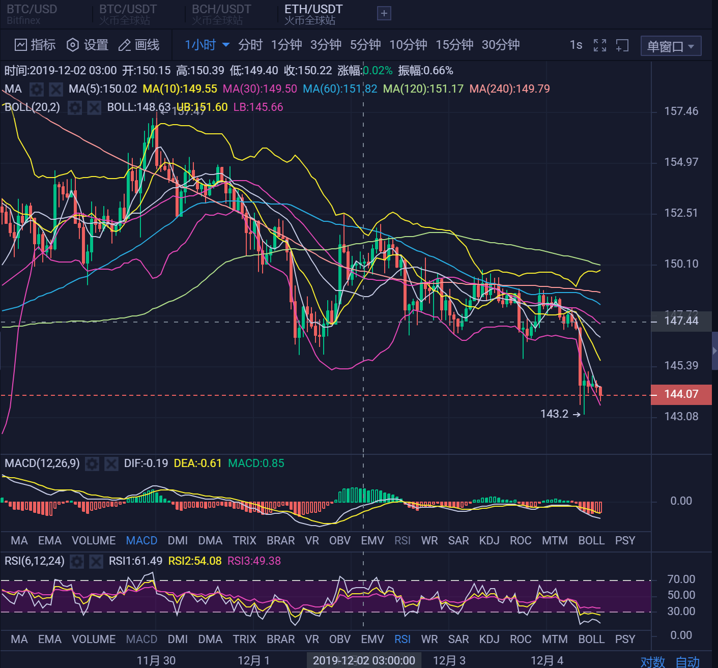ETH:当前价格144.2也是高位做空,轻仓止损146,目标看140附近。以太日线连续下跌,看到140附近也差不多了。