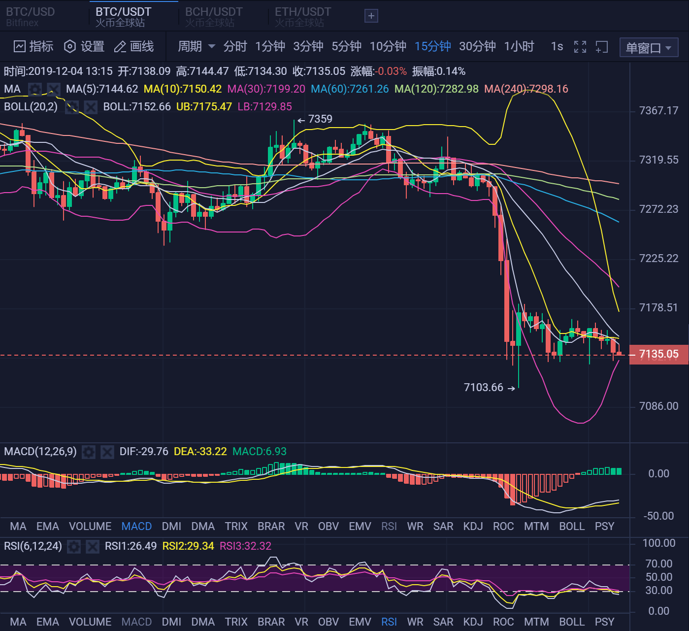 BTC:今天8点不到就开始下跌,跌破前几个交易日的价格中枢,最低7100附近。1小时和4小时图布林带下轨,短线企稳,到下午交易时段短线指标修复一下应该还会回落。日线还有可能重回7000下方寻求支撑,现价7135做空,破7000继续持有,看6900下方。轻仓操作,止损150点。不建议加仓空。