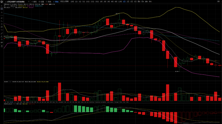 LTC:辣条昨收接近十字星阴柱。当前日线图上MA 5均线下压,MA CD图上两线接近运行。4小时图行情上方遇MA 5 ,10均线,MA CD图上两线相交并行。行情处于震荡整理局面。操作上关注下方43,上方47位置在区间内高空低吸短线及时操作。