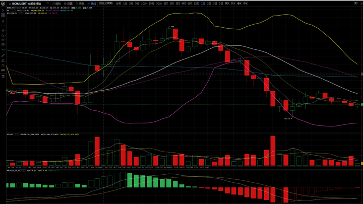 BCH:太子日线也是五连阴。当前日线图上MA 5均线下穿MA 10均线下压,4小时图MA 30均线下行,行情运行在布林带中下轨区间,,MA CD图上两线相交并行。操作思路跟大饼一样关注下方205,上方看212附近在区间内高空低吸短线及时操作。