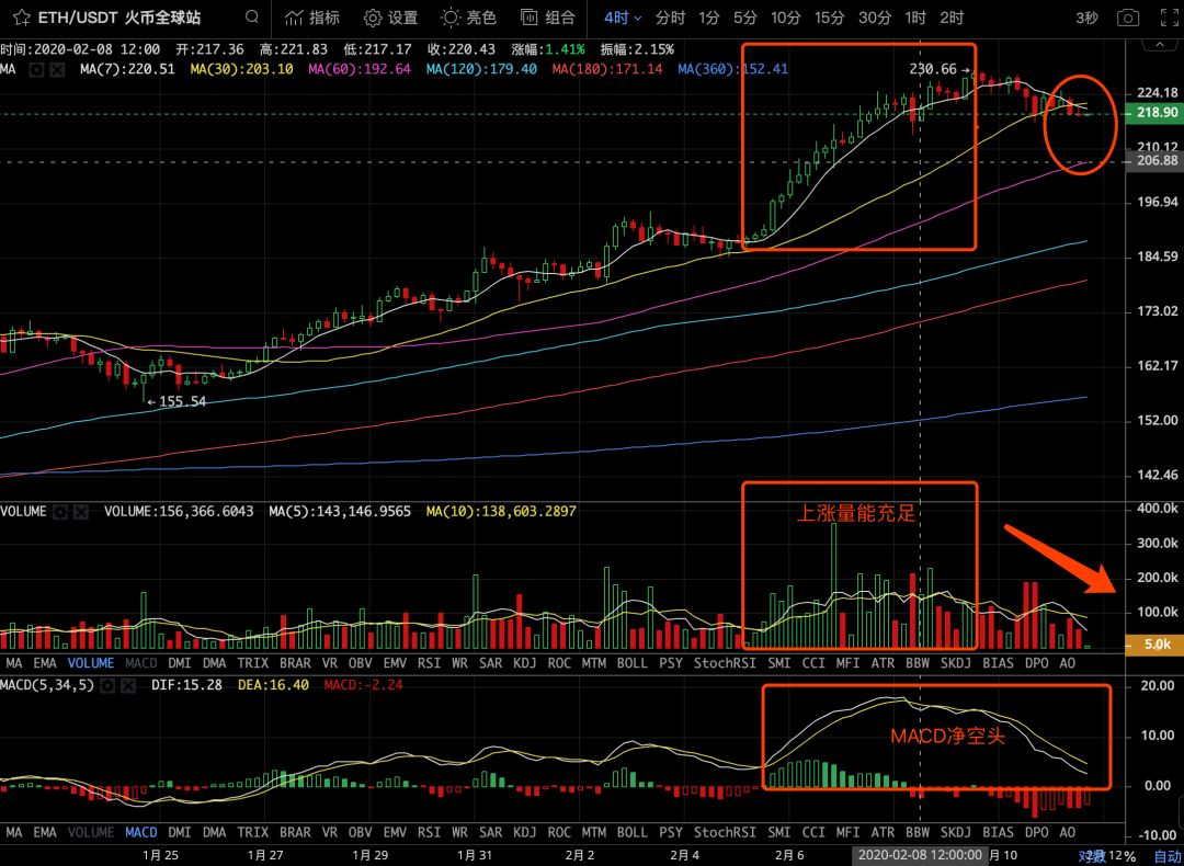 以ETH为例,上涨是量能充足,推动币价持续上涨,一旦上涨量能不足,回调在所难免,目前留意4小时级别,MA30均线附近的整理情况,如果有量能配合,强势站稳MA30均线支撑,则上涨空间打开;但如果量能不足,则有概率继续整理,下方支撑在MA60均线附近。MACD指标也显示,近期的走势由多头转为了空头,后续也需要要有持续的量能,来推动指标再次转多,形成金叉走势,来推动行情。