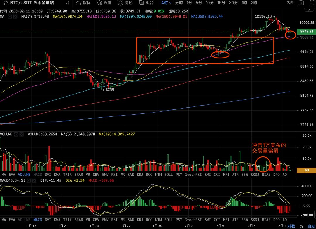 回到行情上,BTC处于4小时级别的回调整理走势,运行在MA30和MA60均线间,短期支撑9600美金,压力9900美金,MACD指标死叉,同时多头量能偏弱,不排除有插针操作,较好的进场机会是K线再次突破MA30均线的时候进场,代表着主力调整结束即将开启上攻走势。