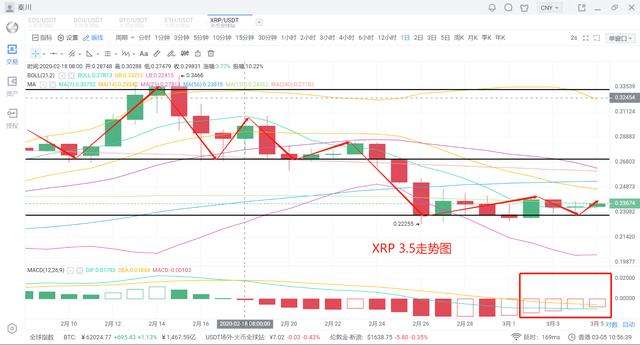 以太当前报价227,这两日以太还是老样子,即使是昨日圈子安排的短线点也没有成功进场,整体就没有太大的振幅,这样的情况之下,自然没有什么太多好说的,继续保持原有的即可。XRP