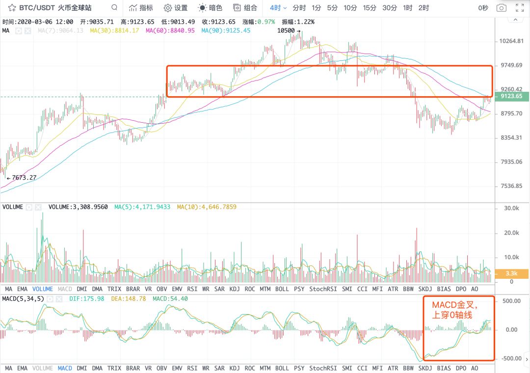 4小时级别,BTC站上了MA60均线,从K线看是真突破,MACD指标金叉走势,经过了几次接力运行至0轴之上,多头的持续发力使得盘面呈反弹走势,有较大概率迈入9100-9700美金区间。