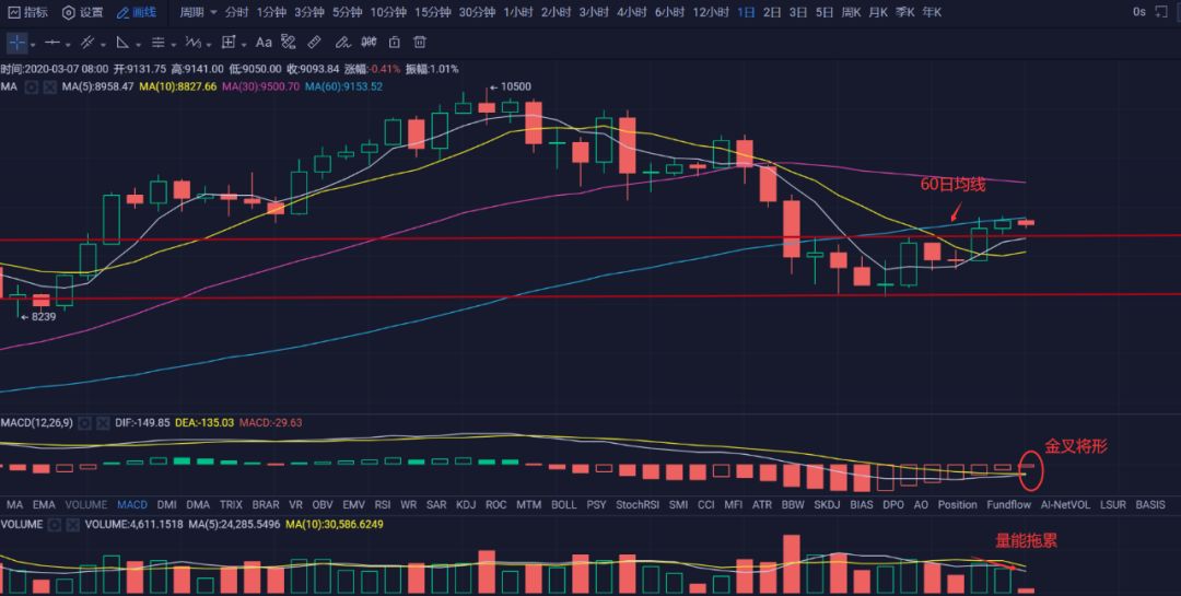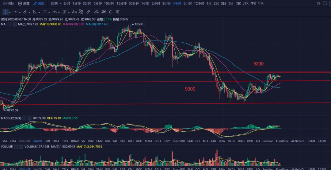 再回到行情上,从日线上看,目前BTC价格走出原本8400-9000的区间,受60日均线压制明显,而MACD上金叉也将形成,所以目前的主要矛盾点是在于K线能否突破9200美元站上60日均线,若是近期能站上9200,MACD也将形成金叉一举站上0轴。主要拖累的还是量能,昨日冲击9200时量能尚未跟上,接下来再度冲击9200时量能若发挥出较好的表现,站上9200并非难事。