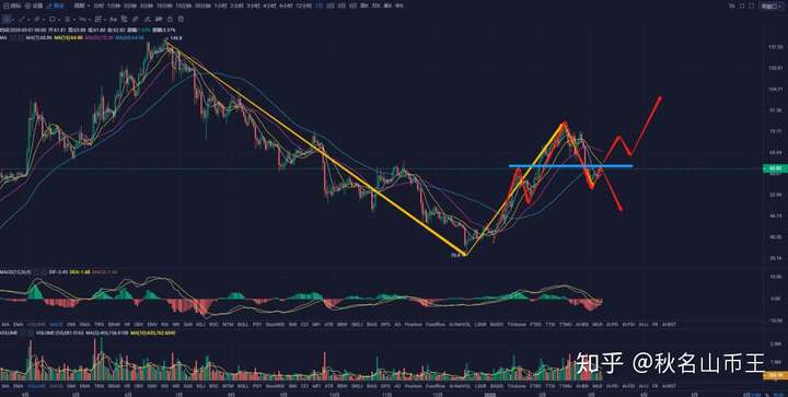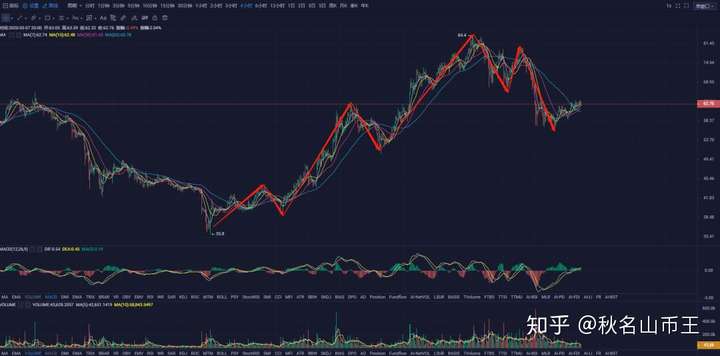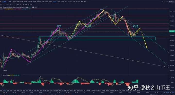 比特币,上图分享的是4小时走势图,首先从大势的角度,分析大势越简单越好,行情尾大不掉的特点,决定一个趋势的形成,轻易不掉头。那就很明显了,现在比特币尚未掉头。