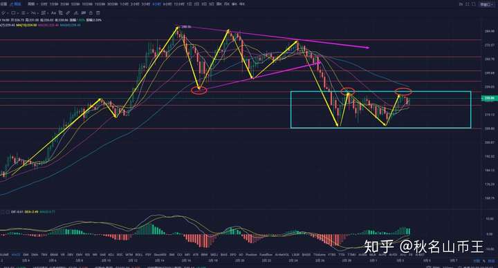 以太坊从前期的连续上扬结构,转为三角震荡,跌破瀑布后驶入震荡走势,震荡高点位为235附近,前期定位的235~240作为压力带,依旧有效。短线上还有机会上攻,中期上按照目前的分析,没有有效企稳240以上,中期以高空为主的思路。