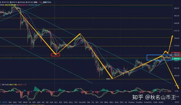 比特现金走势上,本轮还是比较规范,严格按照趋势运作,图中重点框出近期的震荡走势,行情大概率在破位蓝色小箱体后,最终走出方向选择。352作为前期趋势支撑,转现阶段强压。后市的方向,大致可理解为,有效涨破,有突击400的机会,持续无法上破352并企稳,则为蓄力破位300,有望达到下方的挂单现货区间。所以还是以佛系接盘的思路进行。