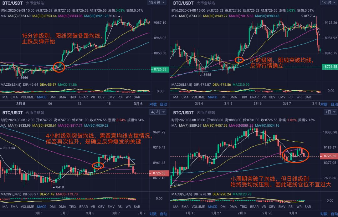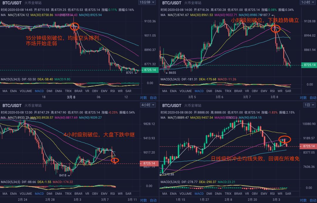 反之币价处于高位时,跌破各周期均线后,且MACD死叉,是不错的做空点位,中间点位尽量不开单,耐心等待更好的机会。