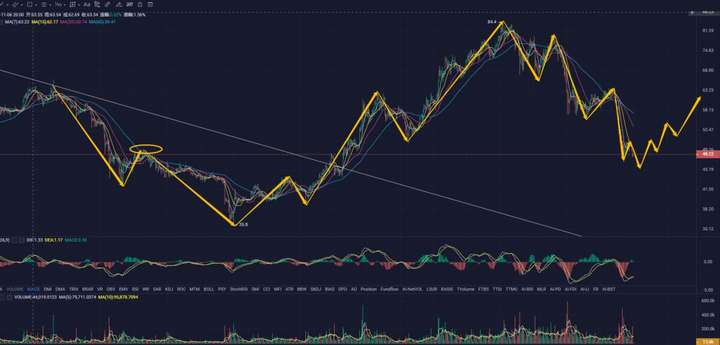 个人在46.8附近入场5成现货,剩余5成仓挂单分两批:41.5~40、34~33