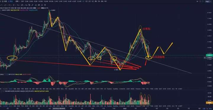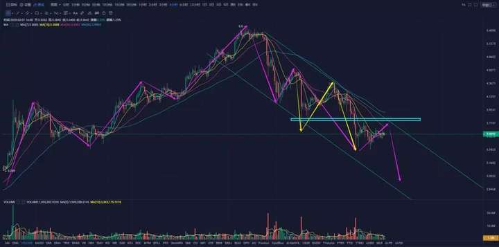 柚子币过去一轮的大幅回调已经是完美预演,接下去的走势,重点关注3.7~3.95的强压,长时间的不反攻,预期演化则会如上图,破3.0