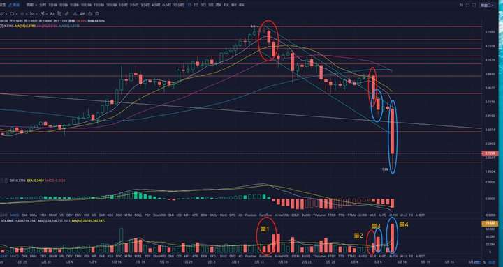 日线级别,主要拉出来看成交量,标记量1的为庄套现出局,量2为庄引导崩盘走势洗盘动作,集中筹码的动作,直接压价。量3为压盘效果,第一批散户丢出筹码,庄第一次接盘,量价的分析上看,非常明显,主力已经开始进场。量4为二次压盘,跌幅超过量3的效果,量大,但并没有超过量3的峰值,价格跌幅比量3要大,这说明今天大户开始丢出筹码,也存在一定的筹码集中度,毫无疑问,筹码再次入了庄的口袋。故而,从日线上,庄目前已经是二次压盘,第一次为了小散手中筹码,第二次为了大户手中筹码。我们2.85、2.55、2.25的现货入场,基本上也算合理,唯一仓位未有金字塔结构是个遗憾。后市已经非常值得期待。后市不断逢低定投现货,问题不大。