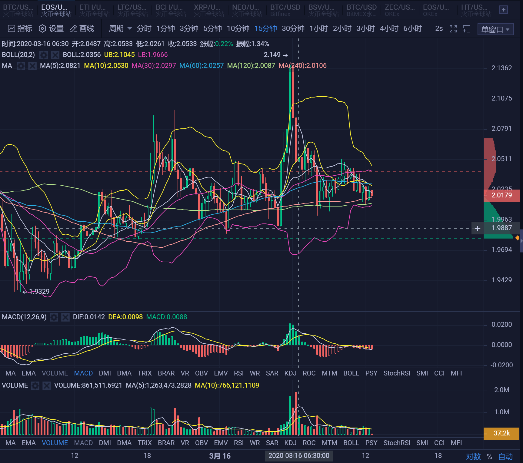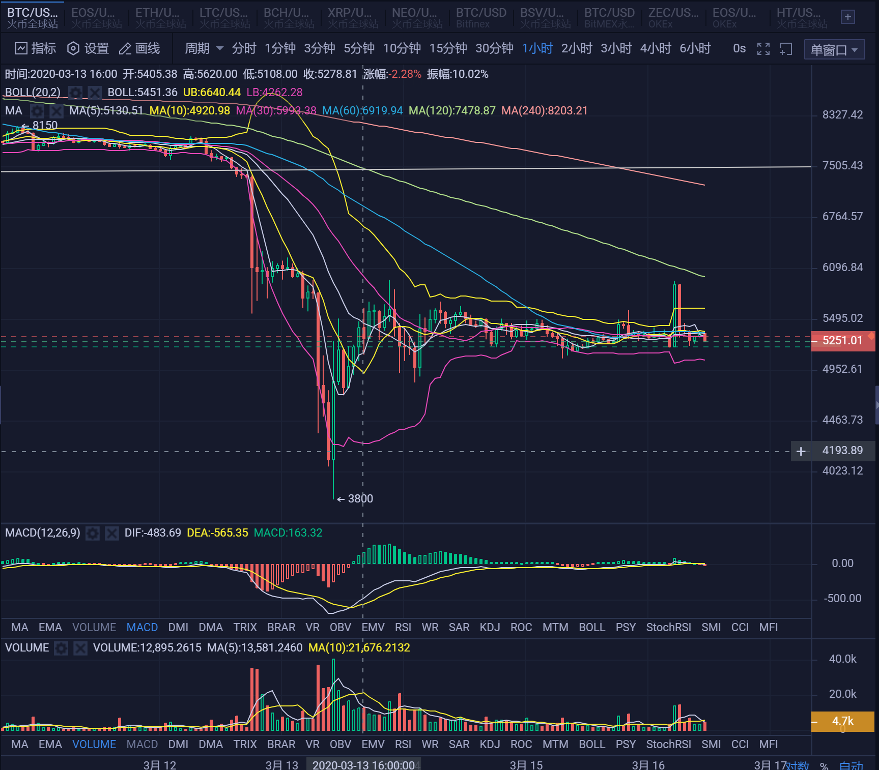今天是3月16日,周一。周末传来消息,美东时间3.15日17时,美国联邦储备委员会将利率降至0%到0.25%,并推出7000亿美元的大规模量化宽松计划,以保护经济免受病毒影响。但是市场并不买账,美股市场仍旧大幅波动,周一的期指开盘又跌停。主要原因是决议的声明比较悲观,反而增加了市场的看空情绪,另外未来如果市场没有发生好转,那么有效的调控手段已经用尽,可见会发生什么。BTC上周反弹无力,于周四开始出现历史性的暴跌,大幅杀跌延续到周五,最低见3800点。但随后展开报复性反弹,于当日反弹至6000美元附近,随后回落展开整理。比特币的避险价值在这次风暴中已经被证伪,未来短时间内发生逆转的可能非常小。我认为本周将在较大价格范围内展开整理,寻求数字货币市场的底部。今天凌晨短时上冲到接近6000美元水平,随后快速回落,下午跌破5000美元整数关口目前最低见4800,对于主力控盘良好的BTC来说,今天的凌晨上冲和下午的回落很大可能是主力资金测试市场的抛压和承接力度。上周的3800点是市场合力的原因,恐慌性的价格。但是主力资金并不会希望打压人气让交易者失去信心离开市场,所幸在低位区间的抄底资金还是比较坚决的,反弹超过2000美金。现在需要知道市场底和短期顶部在哪里。操作上建议:4800水平,也就是当前价格买进。目标位5300,突破看高到5600。随后等回落后再进场,大致位置仍旧是4800到4900水平,但是必须按照自己的风险承受力度控制仓位,仍旧有机会见到极限低位。