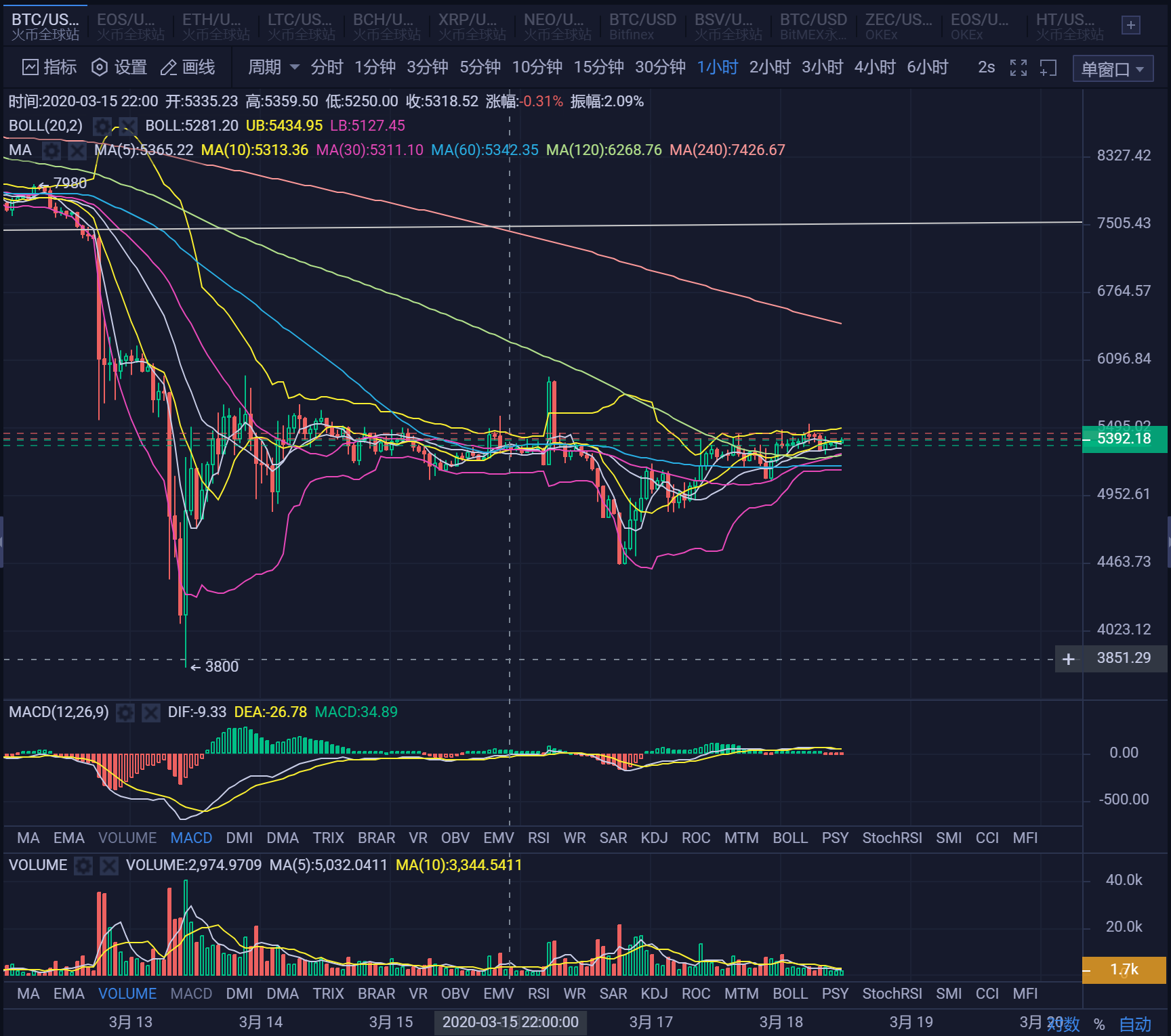 今天没什么特别的好写,写写最近的金融风暴。都说金融危机8到10年来一次,上一次是2008年,美国引爆的全球金融危机。在国内,表现为股市大跌,楼价不振。关于那次危机的起源,如何引爆,推荐可以去看看电影《大空头》克里斯蒂安·贝尔主演《商海通谍》凯文·史派西主演。很清楚的讲述了次贷危机的形成和影响,并且电影情节紧张,演员卡司够大,寓教于乐。主要金融市场的表现是石油创纪录的140上方回到只剩下领头,理由是金融危机导致需求减少,美国页岩气##成功。但是和石油共进退的黄金表现如何呢?08年初见高1032后,作为抗风险的首选的黄金并没有之后一路高歌猛进,反而开始了大幅震荡的行情,甚至一度跌至700美元。而美指则在危机初期的一路下滑后,反而开始上涨。可见,资金在危机中最青睐的还是:安全。而放眼全球,软实力和硬实力的翘楚,还是。。。即使是黄金,在流动性紧张的时候,还是不能独善其身的。那么经过十几年后,全球再次迎来一波危机,但谁也没想到,引爆危机的是:##。其实我个人认为这个也是很好理解的,全球范围的公共危机,让美国结束了长期的牛市。我们回头看看美股,就会发现,其实09年初以后,但凡有点眼光的投资者都能在美股中赚到大钱,看看苹果,波音,高盛这样的公司的涨幅,你就知道了,现在的下跌其实是美股还债来了,都赚了大钱,干嘛不兑现?你不卖我卖,大家卖就成现在这样了。雪崩的时候没有一片雪花是无辜的,现在卖只是把贵了的东西卖出去兑现而已。所以,也没什么好慌的。那么中国股市呢,我们的经济增速长期领跑全球,所以现在有说法,我们是全球的估值洼地,这个说法是有道理的。那么现在又来到原油30美金,黄金开始震荡的时候了。真像上一次危机,怪不得说,阳光下面没有新鲜事。所以不要紧张。那么回到币圈,我还是认为,外面腥风血雨和币圈关系不大,美国的养老基金也不会抄底比特币,圈内的资金也不会去抄底美股,就是这样。只是10500的兑现加杀多头,仅此而已。那么现在5000了,后市会怎么走?说了一大推全球,美股,这个那个,还是回到手里的手机,该怎么看后市?我只能说说我个人的浅见。我认为BTC去3800附近是有可能的,你要放大到日线,周线去看这个问题,筑底一般是反复的过程,并不是3,5天的事情。但再低的话,是没有必要的,市场是需要人气的,特别是这个年轻,稚嫩的市场。搞到尸横遍野那是杀鸡取卵。所以现在差不多就是合理的位置了,但是需要市场确认,达成共识,就是所谓的市场底。那么未来的牛市呢?或许你又想知道这个答案,那么我说,我不知道会不会有牛市,反正很多大V说有,火币,OK的老板说有,他们是大腕,问他们去。未来半年,我看看到8000不错了。你知足吧。。