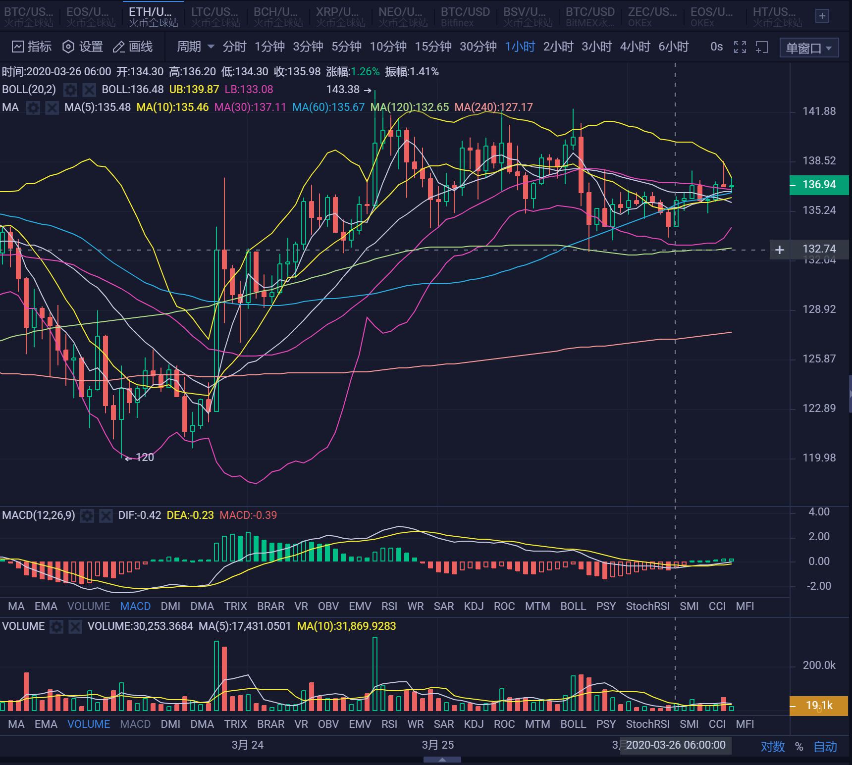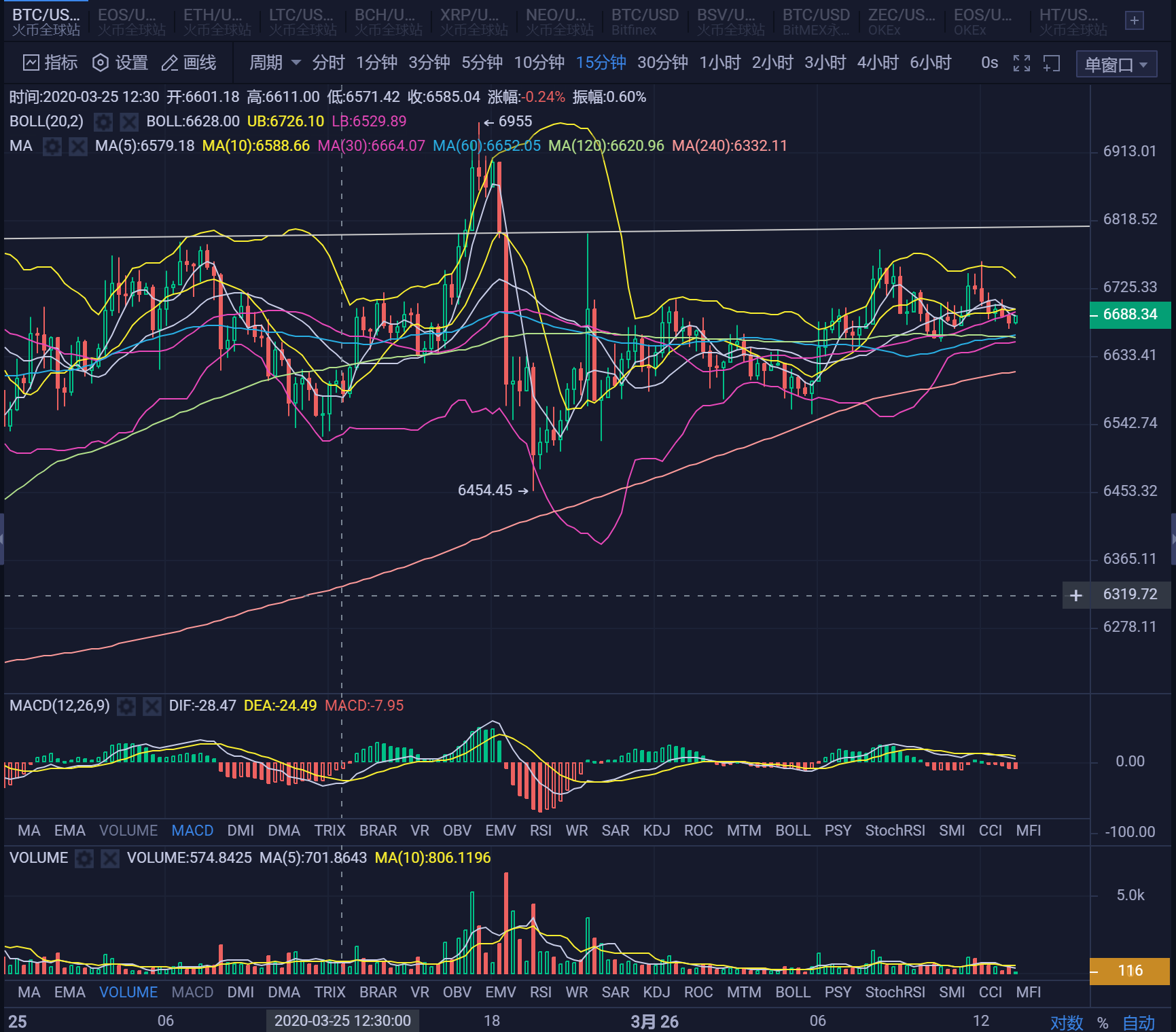 昨天美股开盘小幅下跌后开始大涨,但尾盘跳水。最近美国频繁出台救市政策,最亲民的要算准备每户发3000美元现金,我想要是发比特币,那不是蛮好吗?大饼价格肯定飞起来,大家开心啊!行情还是胶着的,昨天一度下跌到6500下方,但是还是收上来。短期6500到6800的区间已经走的够久了,耐心等待选择方向。BTC还是维持看回调的看法不变,币世界的这次参赛文章是泡汤了,不过行情观还是不变的。跌多了要涨,涨多了要跌,庄家不会解放散户,解放你就是要拉高再套你,这是亘古不变的道理,只是币圈有点疯狂,还是要打破传统思维,把价格的顶和底的区间放大,这个就叫与时俱进吧。