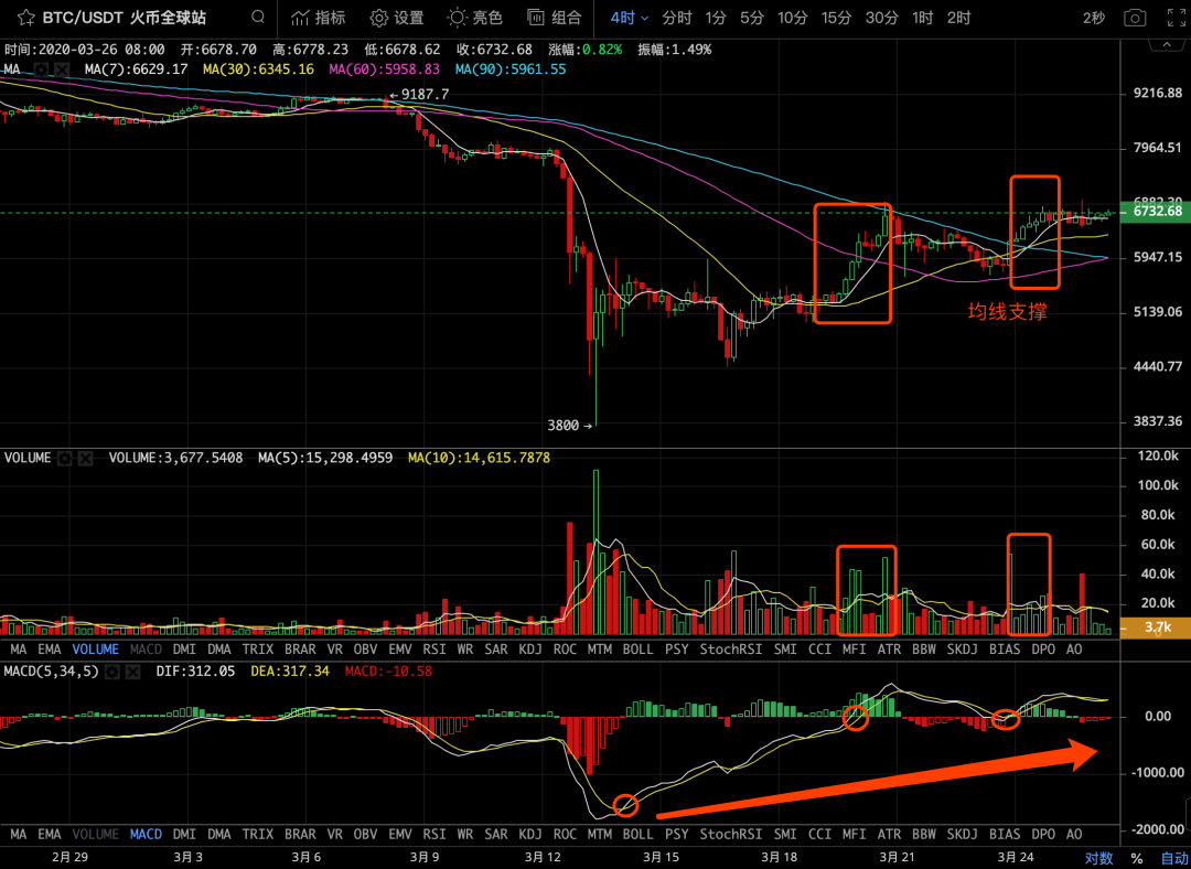 回到比特币行情上,先来说日线级别,整体上呈修复反弹走势,MACD金叉后快慢线差距在拉大,并逐步向0轴运行,净多头的力量略强。