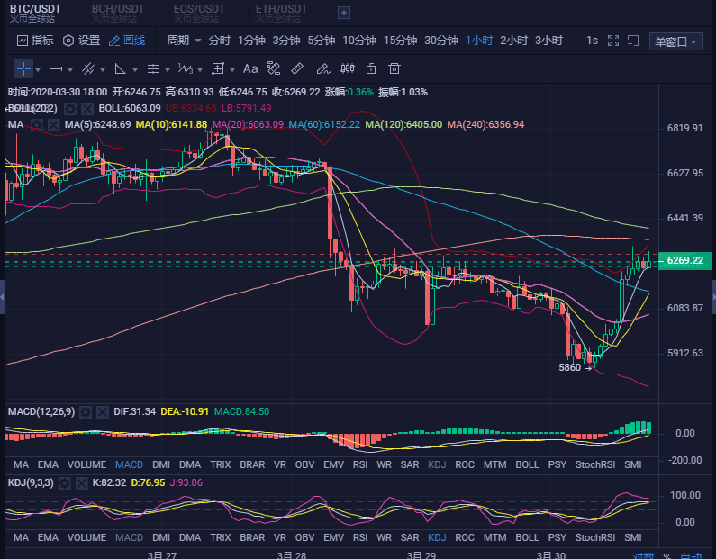 上周BTC没有出现大幅回落,反而再次上冲到7000附近,但是仍旧无功而返,盘整了4个交易日后 选择向下发展。今天早晨跌破6000整数关口后,价格被迅速拉起,重回6200一线整固,显示下方买盘还是比较强的。今天盘面反映24小时涨幅居前的是BTC,和BCH,BSV,都是有减半利好的。那么随着减半的陆续到来,减半币快速下跌的可能性似乎不大。但是能否继续看涨呢?我仍旧认为中继的反弹出现还是很正常的,7000遇阻,是大幅反弹后有回撤的需求,另外向上的空间也不大了,再次向上可能面临较大的抛盘。市场还是大跌之后惊弓之鸟的状态。所以本周对BTC走势的看法是震荡回落,等进一步回落后买进,并且是小幅反弹后就获利了结。当前6260观望。适合入市的点位是5600,反弹后跌破5600的话再次进场等5250附近。