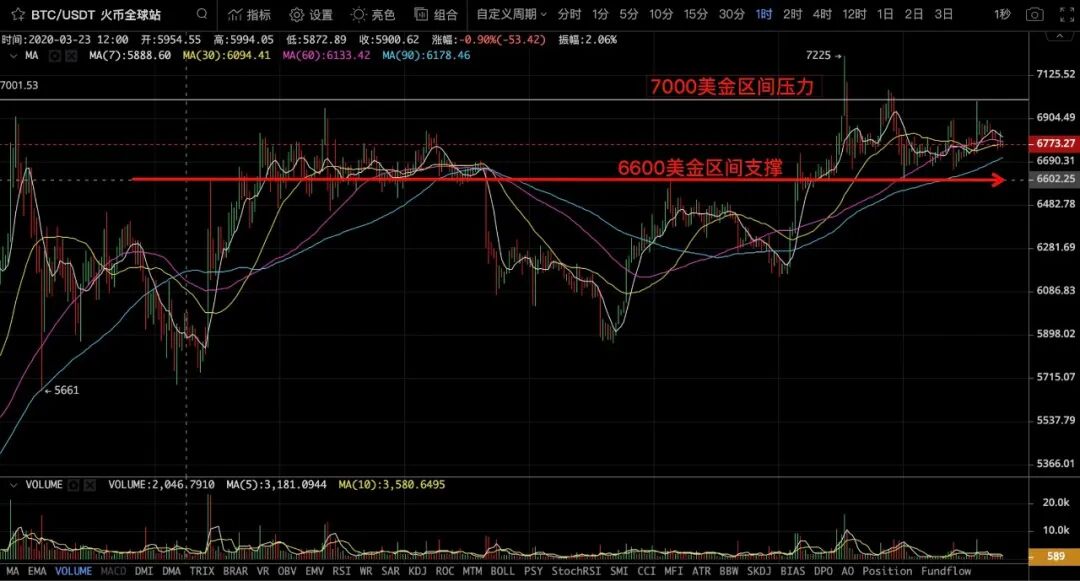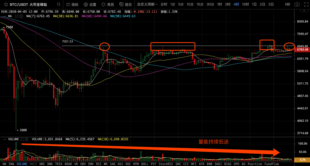 目前需要关注的是7000美金附近的量能情况,有效突破必须要有反弹量能的配合,否则长时间的插针、迟迟无法突破后,会消磨市场上仅存的多头信心。我们操作上还是按照震荡区间来做防守,小范围内的低吸高抛操作,或者继续观望,等待趋势明确后再进场不迟。