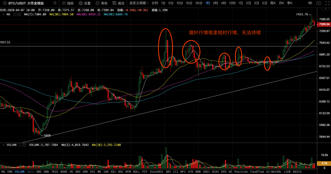 短时行情:这种突发行情,会在5分钟-1小时内结束,具体表现就是插针操作,短时的上涨后下跌。这种行情不具有持续性,因此我们可以通过分析后续的行情,最多不超过4个小时,来判断插针后的走势是否延续,一旦无法延续的话,行情还是会按照插针前的趋势运行。这种行情,能抓住最好,抓不住错过了也无关紧要。