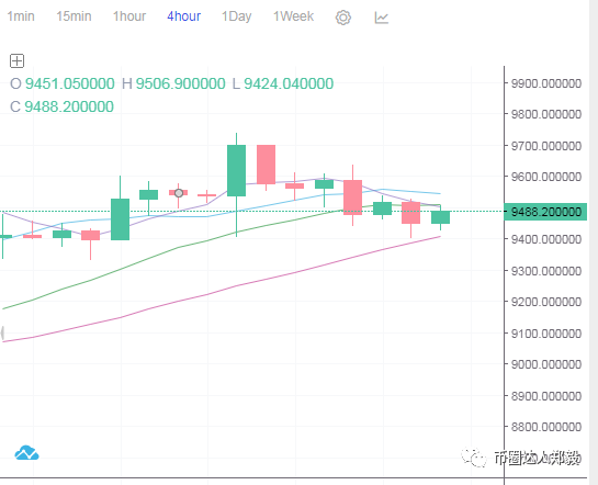 4小时布林带来看,目前比特币行情在中下轨附近,布林带开口持平,后续行情大概是向下放量的,从指标来看,MACD在0轴上方呈死叉向下放量,RSI和Stoch均保持合并下行,后续有继续向下回调的趋势,下方支撑位在9350,破位继续持有,操作上还是高空为主,低多为辅。