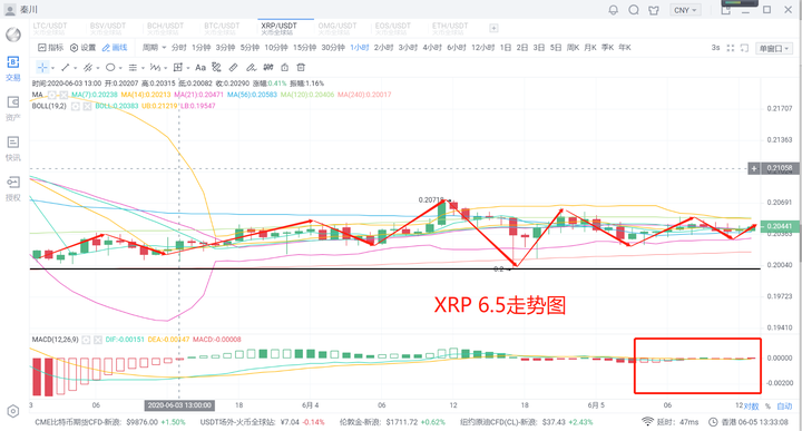 瑞波和以太一样,偏于弱势,那么思路上不需要大幅度修改,延用昨日的区间0.2-0.21之中,继续偏于高空,唯一注意一点,一旦大饼大幅度向上插针,则不选择空单进场,耐心等待大饼插针结束。