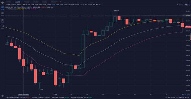 ETH:以太坊受大饼影响较深,在昨晚下行至235位置附近迎来强势反弹,目前价格在245.2位置附近波动,布林带上轨尚未打开,后续价格上行较为困难。强压力依旧是关注从366.5形成的下跌趋势线压力250附近,日内的支撑暂且关注235附近。可以看到下跌趋势的压力和上涨通道下沿压力预计三天左右就会重合,且压力位在逐渐下移中,若晚间不能强势突破该压力,那么短期可以回形成一个4小时级别的回调探底行情。支撑位:235美元,压力位:249美元。