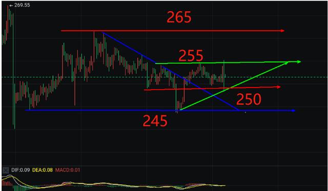 BCH:比特现金也是因为大饼缘故,经过这波冲高回落之后,上行力度已经不足,价格波动逐渐减弱,行情又开始进入区间震荡节奏。小时线来看,早间走了一个三角整理,最低到了245一线,开启一波反弹,最高到了255附近,在250附近一个支撑,开启了一波反弹。这个三角整理是向上的,区间震荡同样没有改变,整理区间是245-260,所以操作上建议低多为主。