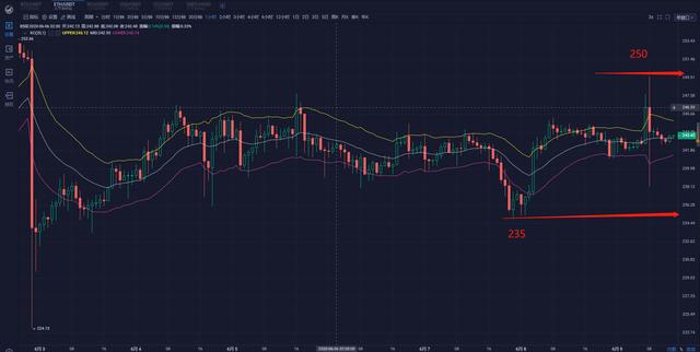 ETH:以太坊的走势和大饼相似,同样是早上冲了一波高点,快速下跌最低到了238这个位置,上下一针,点位没变,同样是一个低点上移的一个走势。从四小时以及日线级别上来说,大的趋势依然还是多头有优势,那么还有一点就是以太2.0现在为市场的一个热门,是值得我们关注的。短期内不管是上涨还是下跌,都没有足够的动能。上方压力250,下方支撑235,操作上还是以低多为主。