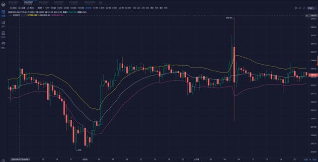 ETH:四小时线来看,布林轨道开口平行,早间币价一波拉升上行至249一线附近,随后空头来袭一路下行至238一线附近触底反弹向上,目前币价重回到布林中上轨区域,运行在243一线附近小幅调整,从均线中来看,MA5均线上穿各均线平行与MA10均线粘合在币价上方形成短期的一线压制,目前多空双方陷入焦灼状态,附图技术指标中,MACD快慢线粘合在零轴上方平行,空头能量有所缩量,RSI三线有拐头上行的走势,KDJ死叉向下发散,整体来看,目前行情属于震荡走势。操作上建议高空低多即可。