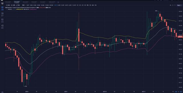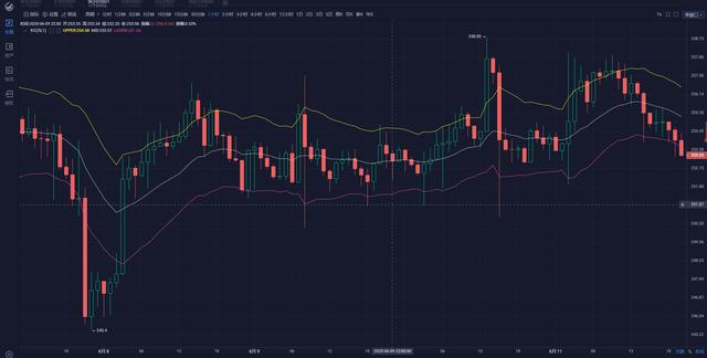 ETH:四小时来看,布林带开口形状,昨天小阳线收尾,在凌晨以后阳柱拉升,插针突破布林上轨,价格在布林上轨上方运行,最高来到250位置,随后价格回落到布林上轨附近。MA5迅速上扬来到价格下方,形成了一定支撑,各均线在K线下方均衡排列运行,这波下跌是插针下来的,下方支撑比较强烈。从长期来看依旧看涨,而且以太坊2.0的最初版本也快要上线,这是很大的利好消息。短期行情来看,目前仍有回调需求,如果行情触及242一线能企稳,则可轻仓做多尝试。