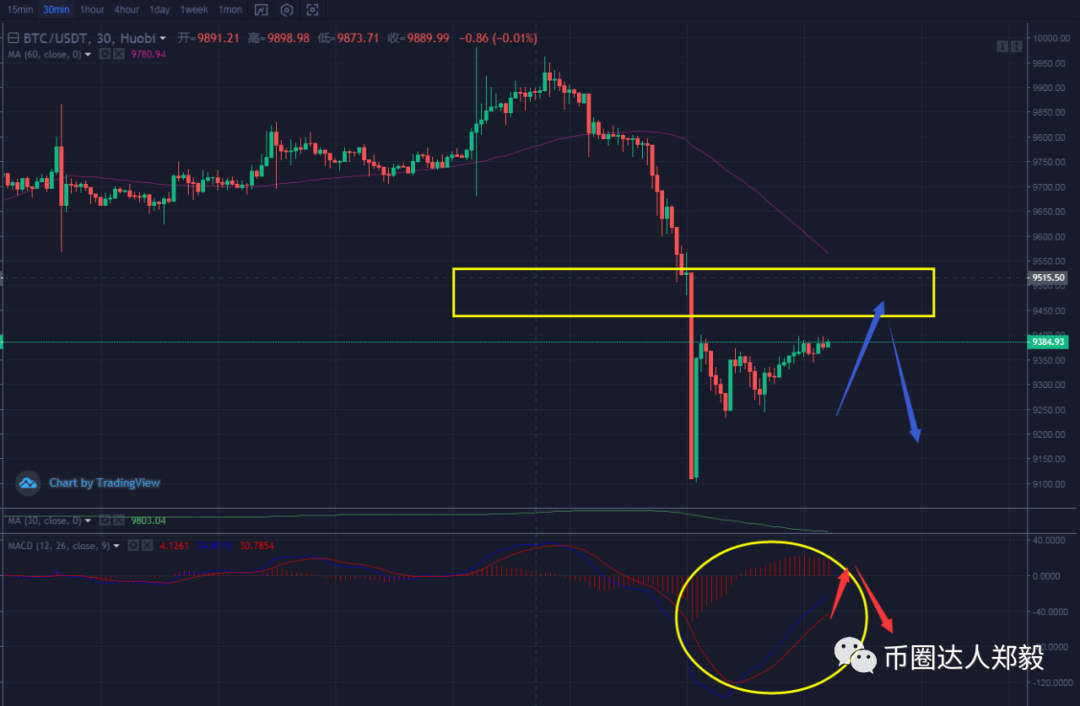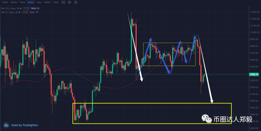 昨天这个美联储突发事件,使得BTC的4H-1H小时稳定结构被打破了,4H的中枢被破坏,现在就要看能不能再回到4H的中枢里,9300正好是4H的一个中枢底部分界线。