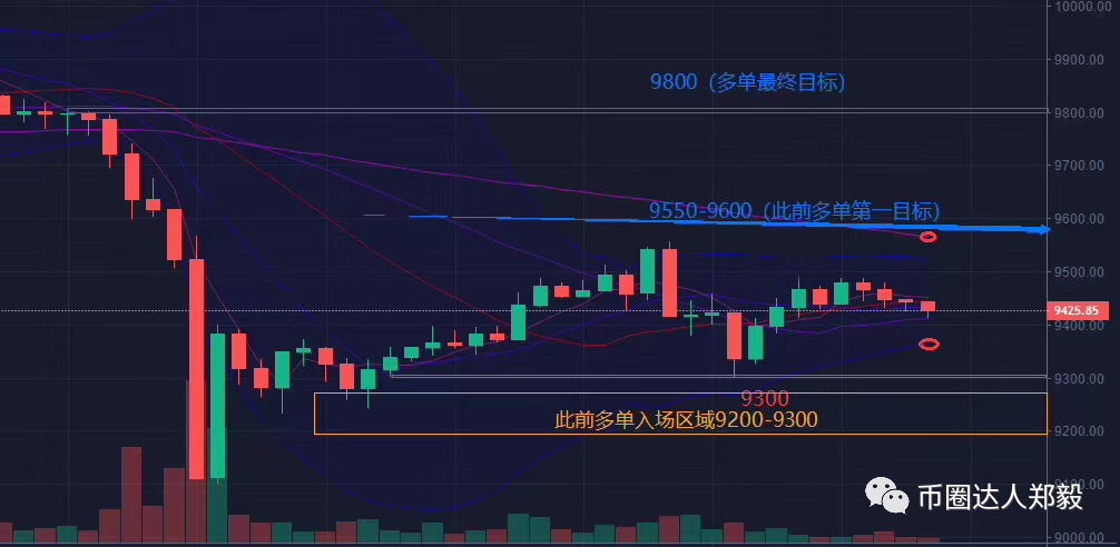 昨天凌晨最低下探9100后,比特币行情处于反弹修复阶段,反弹不过9600,期间回撤至9300,目前在9400上方区间整理。小时线级别MA60均线构成压力线,短时关注9300-9600区间内的盘整情况,突破需要量能的配合,未成功站稳9600一线之上时,有再次回撤的风险。而此前比特币在9200-9300买入多单的用户,目前比特币持有着即可,长期持有,一步一个脚印,先看9500-9600的中转站(即小时MA60均线和日线MA5均线),行情震荡之后将继续盘整上行然后看9800的盈利出局目标。