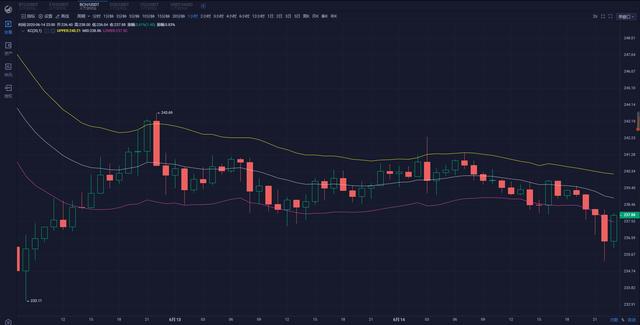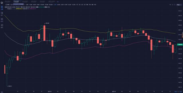 ETH:经过白盘的震荡,晚间行情再次下探233附近,虽有反弹,但量能终不足。目前行情处于中轨下方235附近。现在上方有5日均线的压力位一时间还是比较难以突破的,MACD量能柱在下跌缩量的状态。四小时线长期运行在中轨下方,已经走到三角区间节点,目前这种状态下的ETH行情很有可能直接收一根阴线打一波止盈点再反弹,建议不宜做多,ETH反而可以看一波空头趋势。