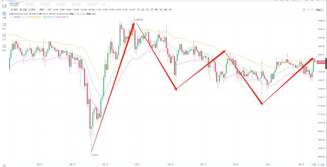 行情回顾:比特币从6月16号开始呈现出一个明显的走势特征就是几根阳线拉出,之后不断震荡向下,体现其走势务必发力,昨日整体走势杨凯预计也是一个先涨后跌的走势,14时最高点触及9419美元后承压回落,今天早间最低点探底9278美元,目前币价反弹9300上方,暂报9344美元。