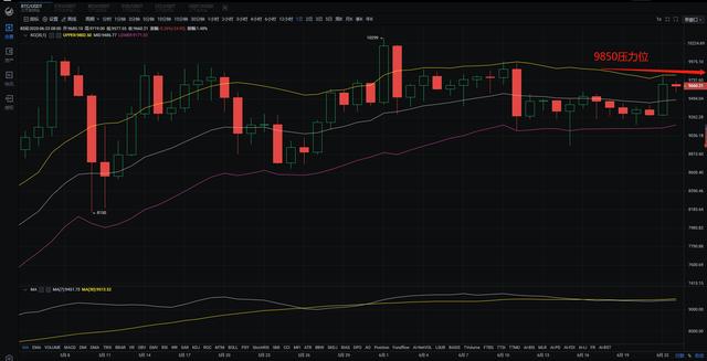 四小时级别看,K线已经五连阳,币价强势反弹后拉拽上轨向上,目前处在一个高位横盘震荡的走势。下方支撑在MA10均线9520附近,KDJ方面钝化有向下运行之势,MACD指标看红色能量开始缩量,两线运行在0轴之上,有转向之势。一小时布林带呈收口状态,MA放量有所缓慢,目前被30均线所支撑着,行情有点向上试探放出虚假能量,但MACD逐渐向零轴靠近,此时需注意零轴点,很有可能会有一波大动作,进行大幅度诱探。