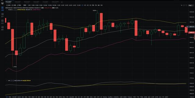 四小时冲高回落,重回三角收敛形态之中,比特币价格在上一个周期大阴下拉之后,目前价格是已经跌破布林带中轨位置支撑的,五日均线下穿10日均线压制价格于9500附近。布林带口越走越窄,短期比特币币价不会走出强势上行,KDJ指标三线并列向上运行进入超卖区,MACD指标快慢平行移动有下行,渐有形成高位死叉趋势。