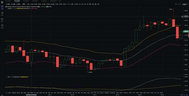 ETH:DeFi热点持续利好,给币价起到利好支撑的作用,但也仅仅只是稳定的短多行情,日线冲高力度回落,上方箱体压制,250美元是周线压力位,只有突破250美元才会打开上行空间。小时线级别MACD回踩零轴,RSI持续超卖,操作上可以暂时减仓观望,只要不跌破233美元,还会卷土重来的,等待235美元附近开始接多,止损231。
