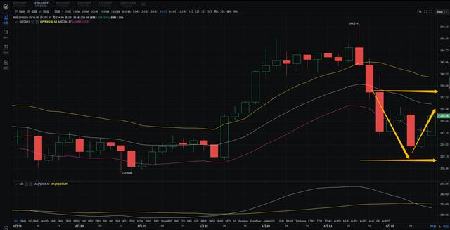 ETH:随着BTC今天回落到了阳线起点,早间以太坊最低点下探227美元一线止跌反弹,目前暂报234美元。从小时图的走势来看,经过了上午的继续下跌,短期内的行情走势破位的可能性不大。目前运行在MA5较远的位置,走势上需要一定的回调修正,而附图指标我们也可以看到,KDJ指标也是出于上行的走势,所以说,以太坊行情经过了这一轮的大涨大跌以后,行情需要一定的修正,压力位:240,支撑位:227美元。
