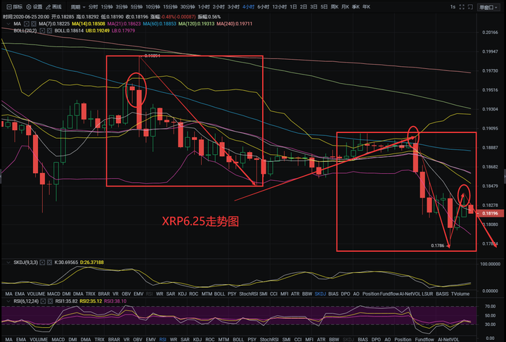 瑞波一样紧随着整个大盘趋势走,中途也没有什么突发的变动,那么这里思路不变高空低多。短线参考点位看0.179-0.188区间,下方支撑看0.170,上方压力看0.22。