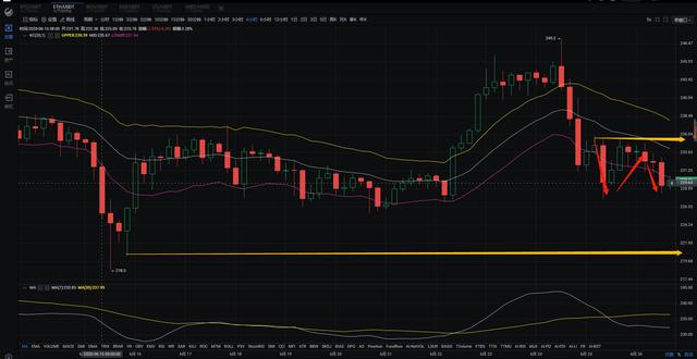 ETH:以太坊前两日受测试网即将落地的影响币价快速拉升,在突破239的箱体上沿压力位后一路绝尘在250附近的整数关口受压回落,短线来看下方226.75的箱体下沿支撑这个位置就是短线进场的好时机。但从行情图上看,多头量能明显不足,相反空头量能始终都处于一个蓄势待发状态。指标上来看M ACD和KDJ都是死叉向下,下方支撑看225,上方压力235;