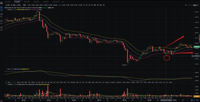ETH:四小时来看,币价位于布林带中上轨附近运行,早间的上探受到压制,MACD快慢线在零轴下方呈金叉,多头能量逐步放量中,KDJ三线有拐头向下的趋势,如果币价稳住在MA30日均线一线,那么后期就有机会继续上行。日内操作上高空低多。